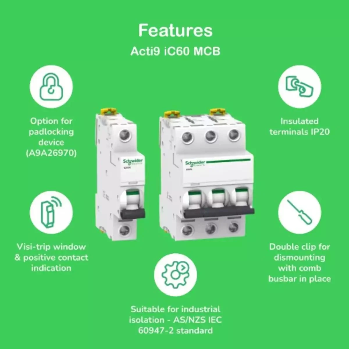 | Breaking Capacity | 50 kA Icu at 12…60 V AC 50/60 Hz conforming to EN/IEC 60947-2, 50 kA Icu at 100…133 V AC 50/60 Hz conforming to EN/IEC 60947-2, 6000 A Icn at 240 V AC 50/60 Hz conforming to EN/IEC 60898-1, 10 kA Icu at 60…72 V DC conforming to EN/IEC 60947-2, 15 kA Icu at 12…60 V DC conforming to EN/IEC 60947-2, 50 kA Icu at 220…240 V AC 50/60 Hz conforming to EN/IEC 60947-2 |