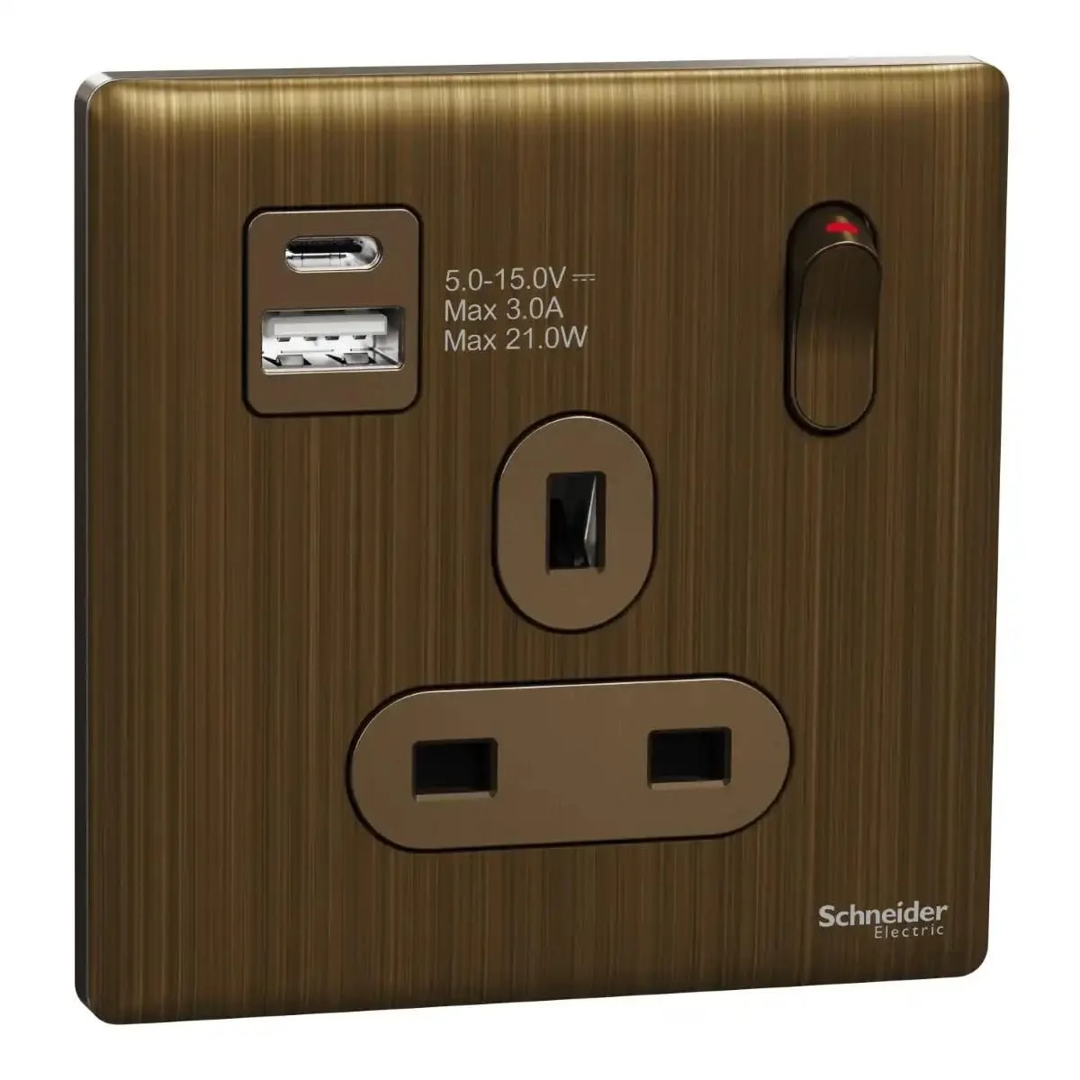 Switched socket with USB, Unica X, 13A, 250V, 2 pole, type A+C, 21W, Antique Bronze